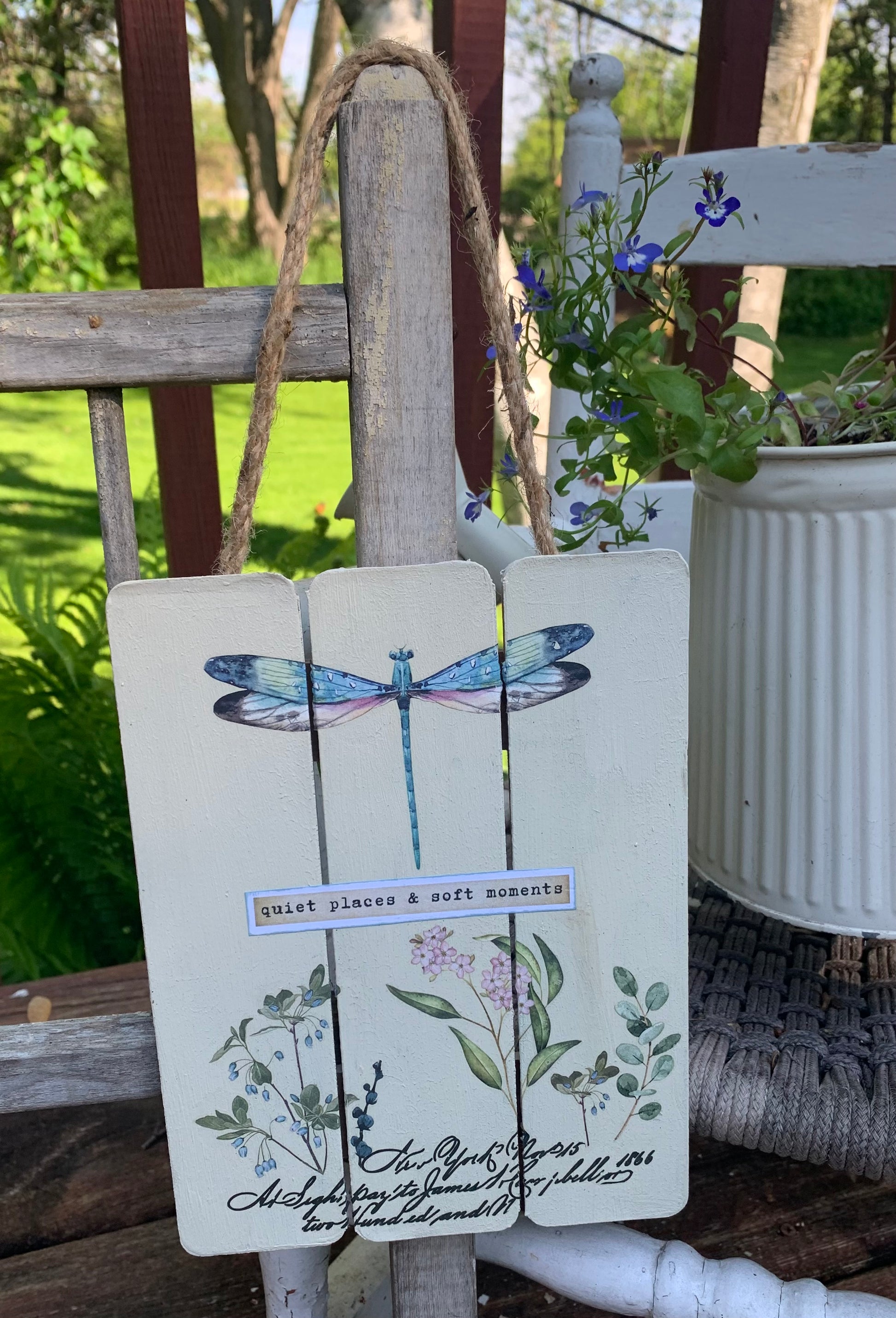 A single dragonfly hovers in gentle motion, rendered in serene shades of blue and pink, like a whisper of summer air. Beneath it, vintage script from the year 1866 drifts across the surface-faint and poetic, like a letter once cherished. Soft pink and blue blossoms bloom above the text, their subtle hues and muted greens lending a timeless charm.