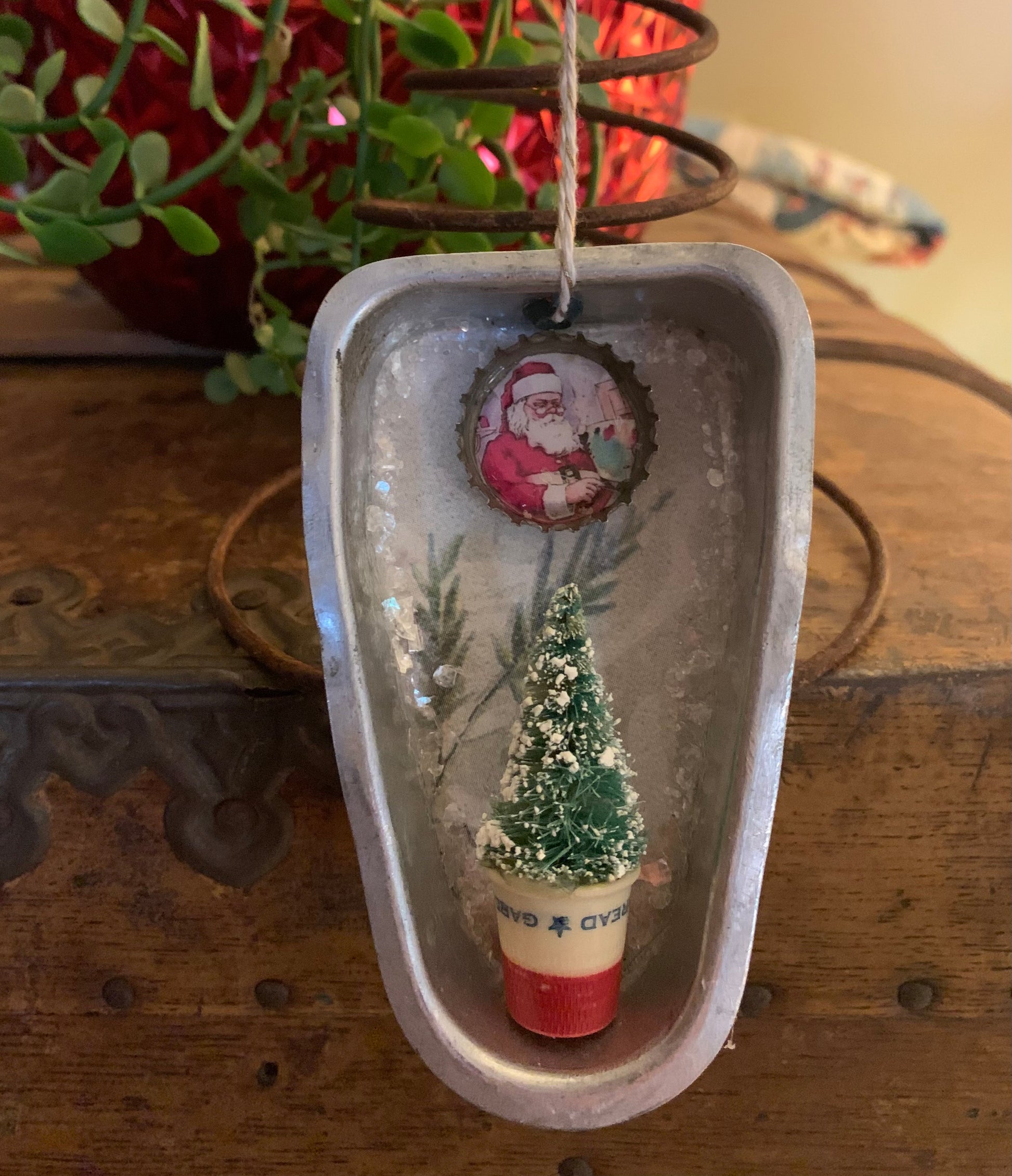 A playful blend of vintage charm and holiday spirit, this upcycled vintage aluminum popsicle mold holds a tiny world within. At the base, a red and white vintage plastic thimble cradles a miniature vintage brush Christmas tree, surrounded by hints of snow and festive boughs. Above, Santa himself is pictured intently writing on his list—checking it twice, no doubt—with a snowy background adding wintry magic.