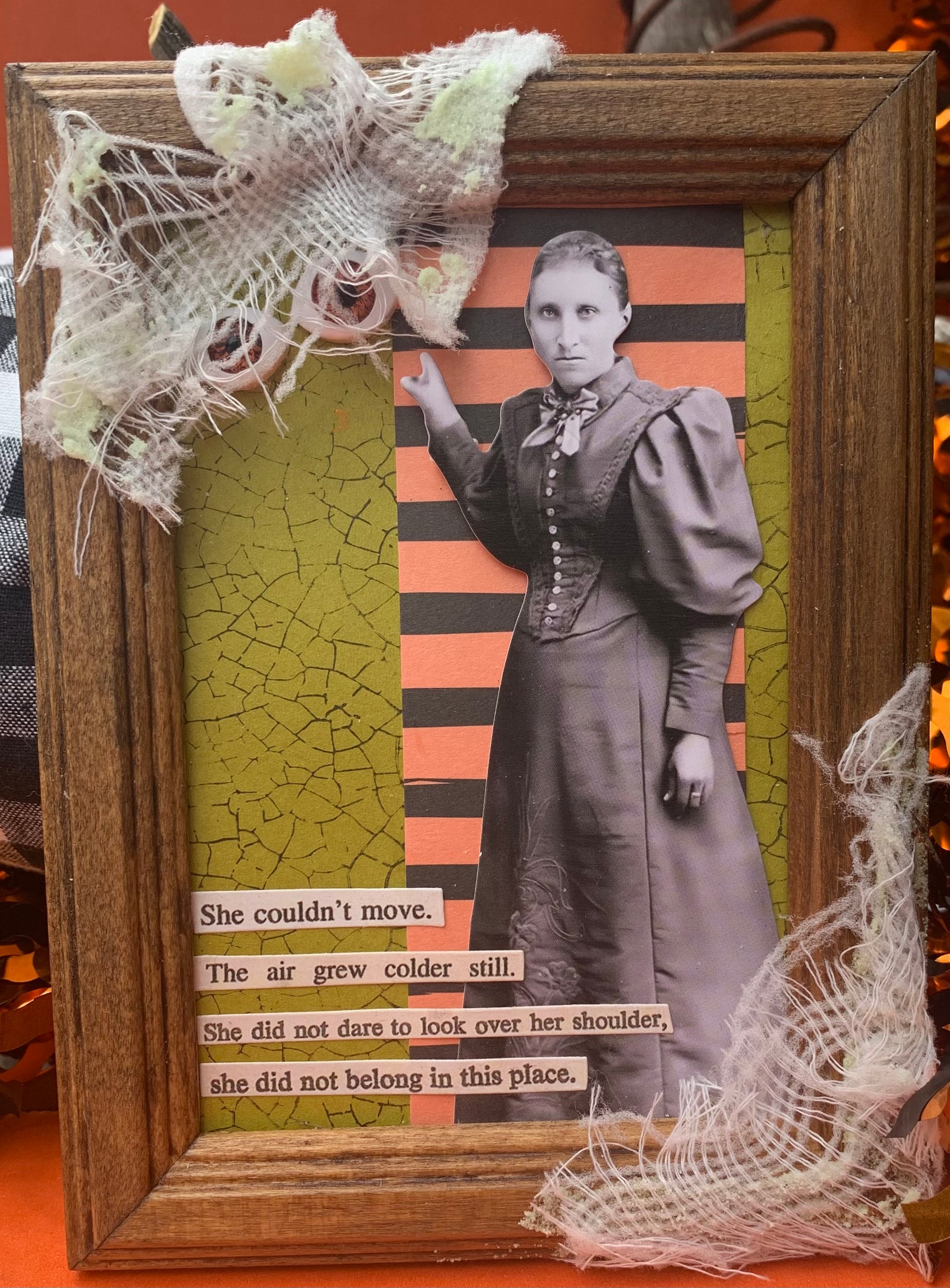 Encased in a 4⅜ by 6-inch standing frame, this haunting vignette features a black-and-white photograph of a Victorian woman caught in a moment of unsettling stillness, her finger raised in silent warning. Draped across the top and bottom edges, layers of eerie gauze veil the scene—wispy and whisper-thin by day but glowing in the dark. Behind the upper shroud, two watching eyes—brown and unblinking—peer out from the gloom, half-hidden yet impossible to ignore. Below, a ghostly poem lingers: She couldn’t move. The air grew colder still. She did not dare to look over her shoulder. She did not belong in this place. A chilling glow-in-the- dark accent to a bookshelf, entry table, or Halloween mantle, this piece invites the imagination to linger... and wonder what might be just out of view.