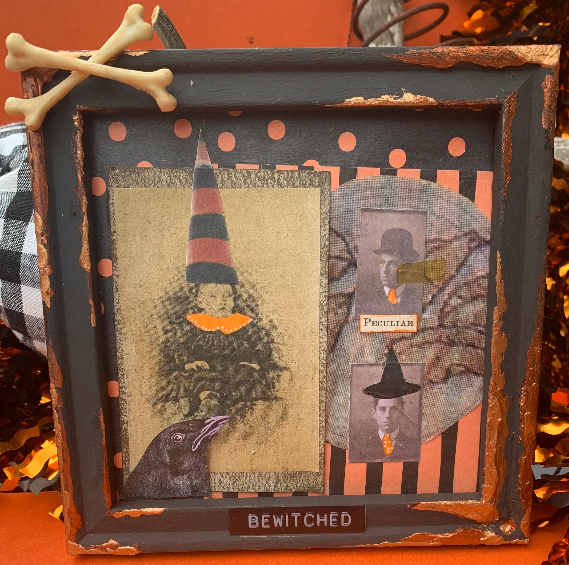 Measuring 5¾ by 5¾ inches, Bewitched is a captivating Halloween assemblage framed in a black standing frame. The background is a lively blend of classic patterns—deep black with playful orange polka dots and vivid orange with sharp black stripes—setting the stage for a wonderfully eerie composition. In the foreground, the head of a black crow gazes upward, lending a mysterious, watchful presence. Just beside it sits a tintype vintage baby photo, the child donning a whimsical witch's hat—an unexpected and delightful twist of enchantment. On the right-hand side, two men pose in formal attire, both wearing orange ties; one sports a classic bowler hat while the other has embraced the spirit of the season with a tall, pointed witch’s hat. Aged tape enhances one of the photographs. Tucked in the upper corner of the frame are two crossed bones, a clever touch that ties together the spooky and the surreal. Bewitched is a striking piece for a Halloween mantel or a side table display. Pair it with antique books, black crows, potion bottles, or candlelight to play up its moody vintage charm. It also works beautifully layered into a dark-toned gallery wall or nestled on a bookshelf.