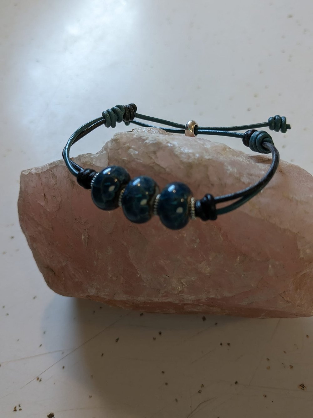 100% black and navy leather bracelet with blue patterned lampwork beads. Adjustable. Fits most wrists.