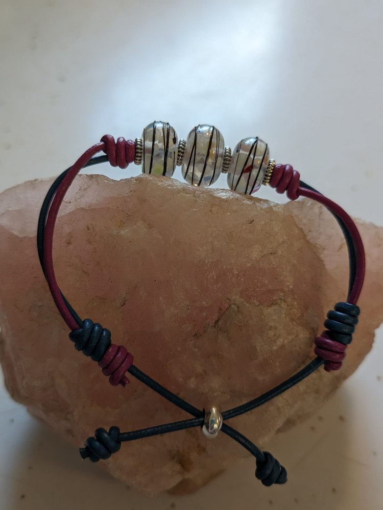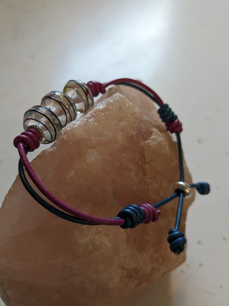 100% leather blue and dark pink bracelet with handmade glass lampwork beads. Adjustable. Fits most wrists.