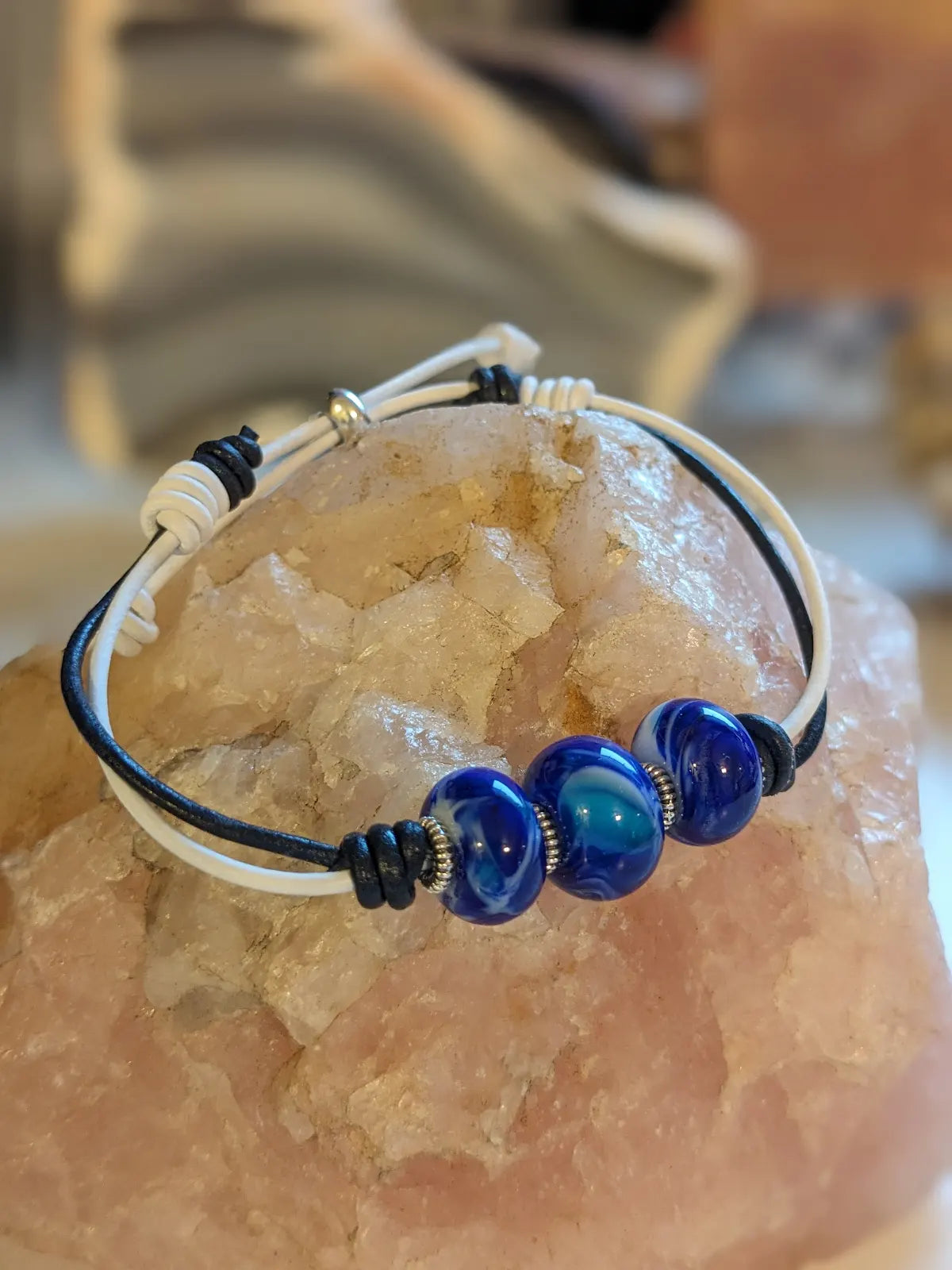 A handmade bracelet with beautiful blue swirl lamp work beads on navy blue and white leather. Perfect for a nautical feeling on the water. Adjustable and will fit most wrists.