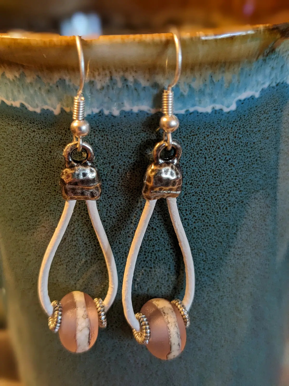 Handmade earrings with blush and white lamp work beads on white leather for a summery look. Tierracast silver findings and silver ear wires.