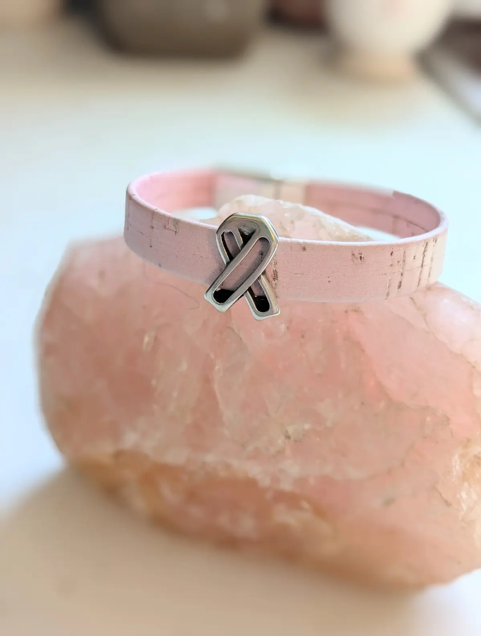 This bracelet is for breast cancer awareness. The band is made of cork for you vegan lovers with a zinc ribbon slider and a zinc magnetic clasp. Will be made "fit to size". Pick your size in the drop-down box.