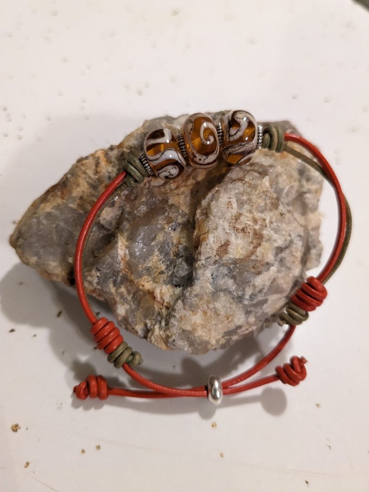 100% burnt orange and olive leather with burnt orange and cream lampwork beads. Adjustable. Fits most wrists.
