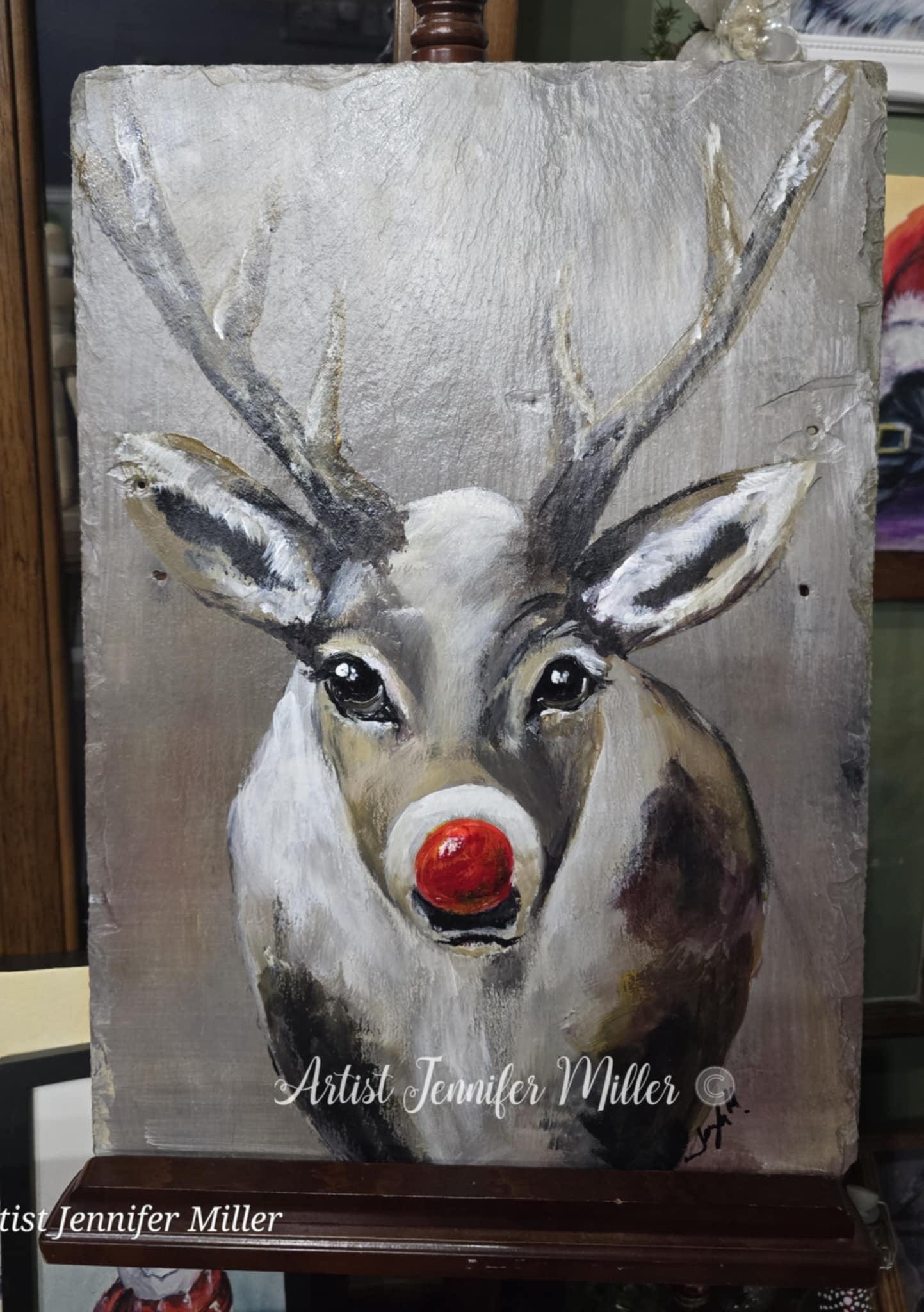 In this card set from an original acrylic painting on natural slate, this bold portrait captures Rudolph the reindeer with his iconic red nose and soulful eyes. With soft brushwork and wintry tones, the piece evokes holiday spirit and charm, while the rugged slate adds rustic texture and timeless character. A festive original by artist Jennifer Miller.