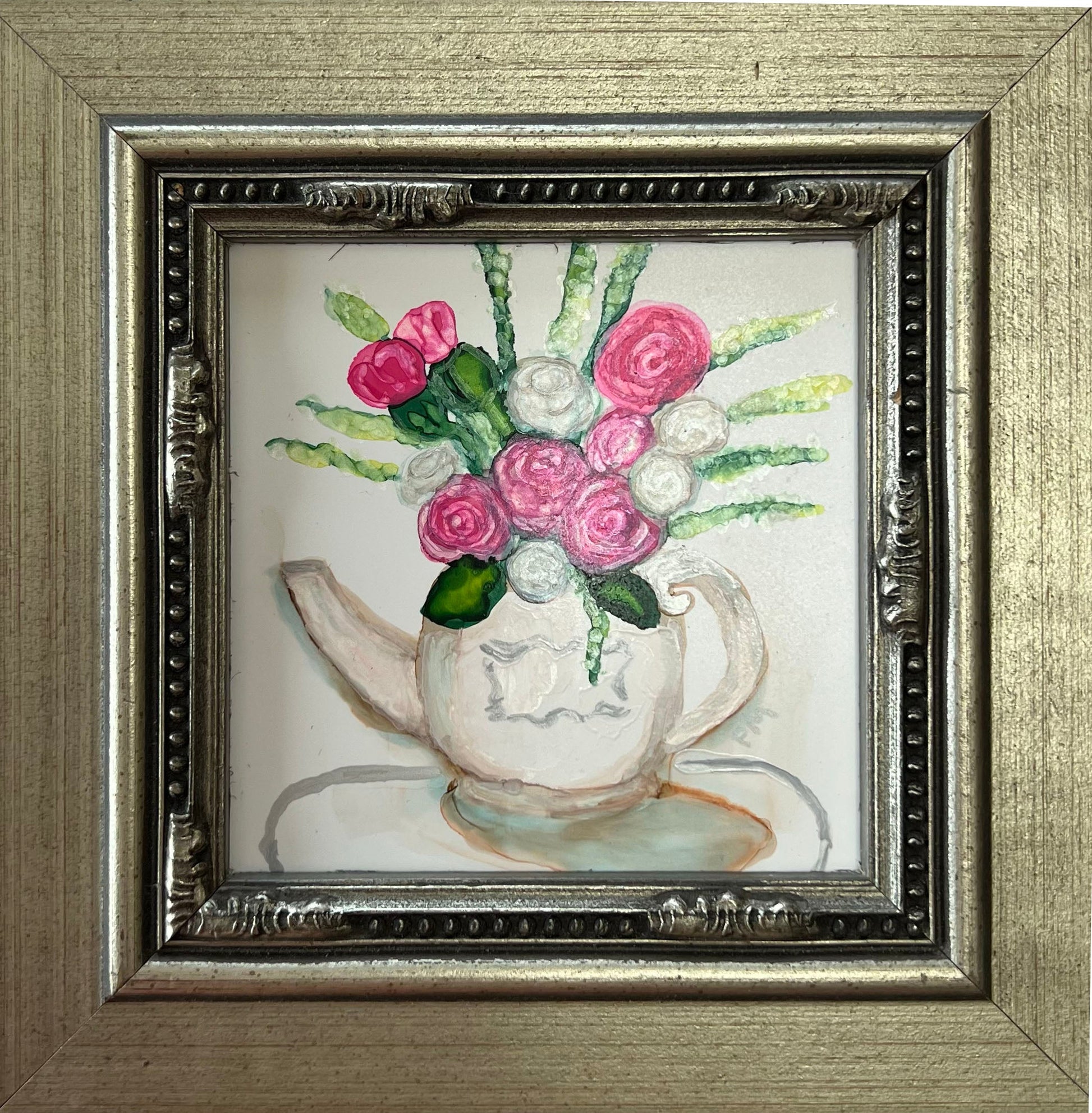 Centerpiece In A Teapot Original Alcohol Ink Floral Painting is of a gleaming silver teapot, at the center of the table, repurposed as a charming floral arrangement. The teapot brims with pink and white flowers, their soft petals accentuated by delicate silver touches that catch the light. Interspersed among the blossoms, lush greenery adds a vibrant contrast, enhancing the bouquet’s natural beauty. The silver highlight on the flowers echo the teapot’s lustrous finish, creating a harmonious and elegant centerpiece that draws the eye and captivates with its refined yet whimsical appeal. Done on 5x5 Yupo paper with alcohol inks, sealed with UV varnish. Silver, wood frame is 8x8 and has a hanger on back.