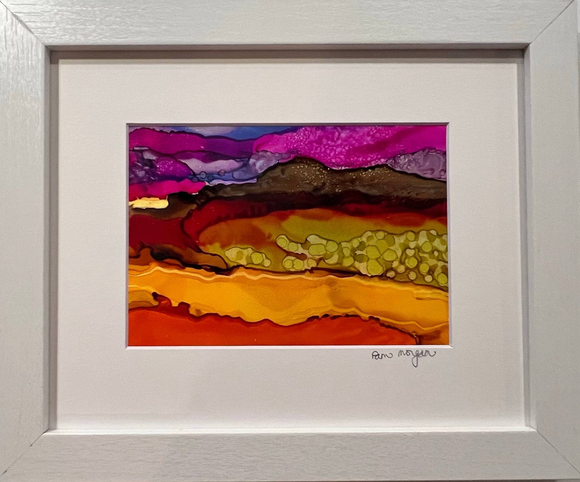 Desert Mirage Original Alcohol Ink Landscape Painting enters the realm of illusion, where reality blurs with the mirage of a desert oasis. Sienna sand mountains rise like ancient guardians, encircling a basin of rocky outcrops that hint at the presence of water underneath. Cascading ochre and red sands create a mesmerizing spectacle, their fluid movements echoing the ephemeral nature of a mirage. Above, the sky is awash with hues of purple, as if the heavens themselves are weeping in awe of the surreal scene below. In this painting, the boundary between dream and reality dissolves, leaving viewers enchanted by the tantalizing allure of the desert mirage. Done on 5x7 Yupo paper with alcohol inks, sealed with UV varnish. White wood frame is 8x10.