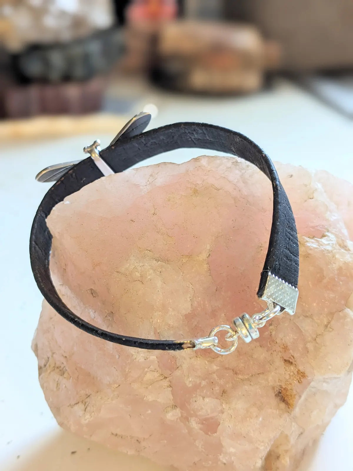 This handmade bracelet is made with 100% leather in a textured black color with a dragonfly slider. There is a sterling silver magnetic clasp. Please note: Do not yank on the clasp. Gently pry your fingernail between the magnets to open the clasp. Size 8