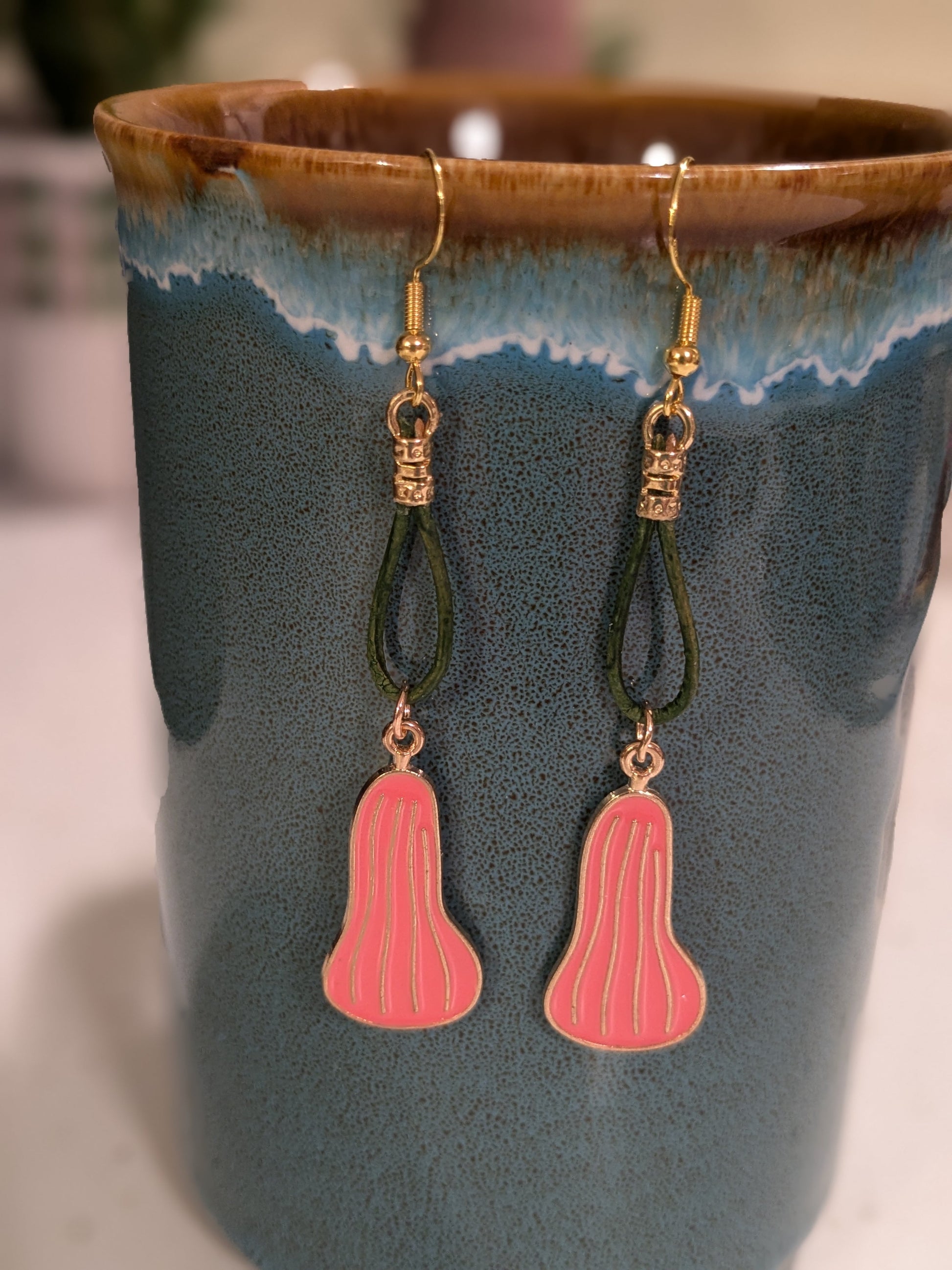 These Fall earrings have orange gourd charms on green leather with gold findings. Hypoallergenic ear wires. Note: these earrings are on the longer side. They measure approximately 3" long.