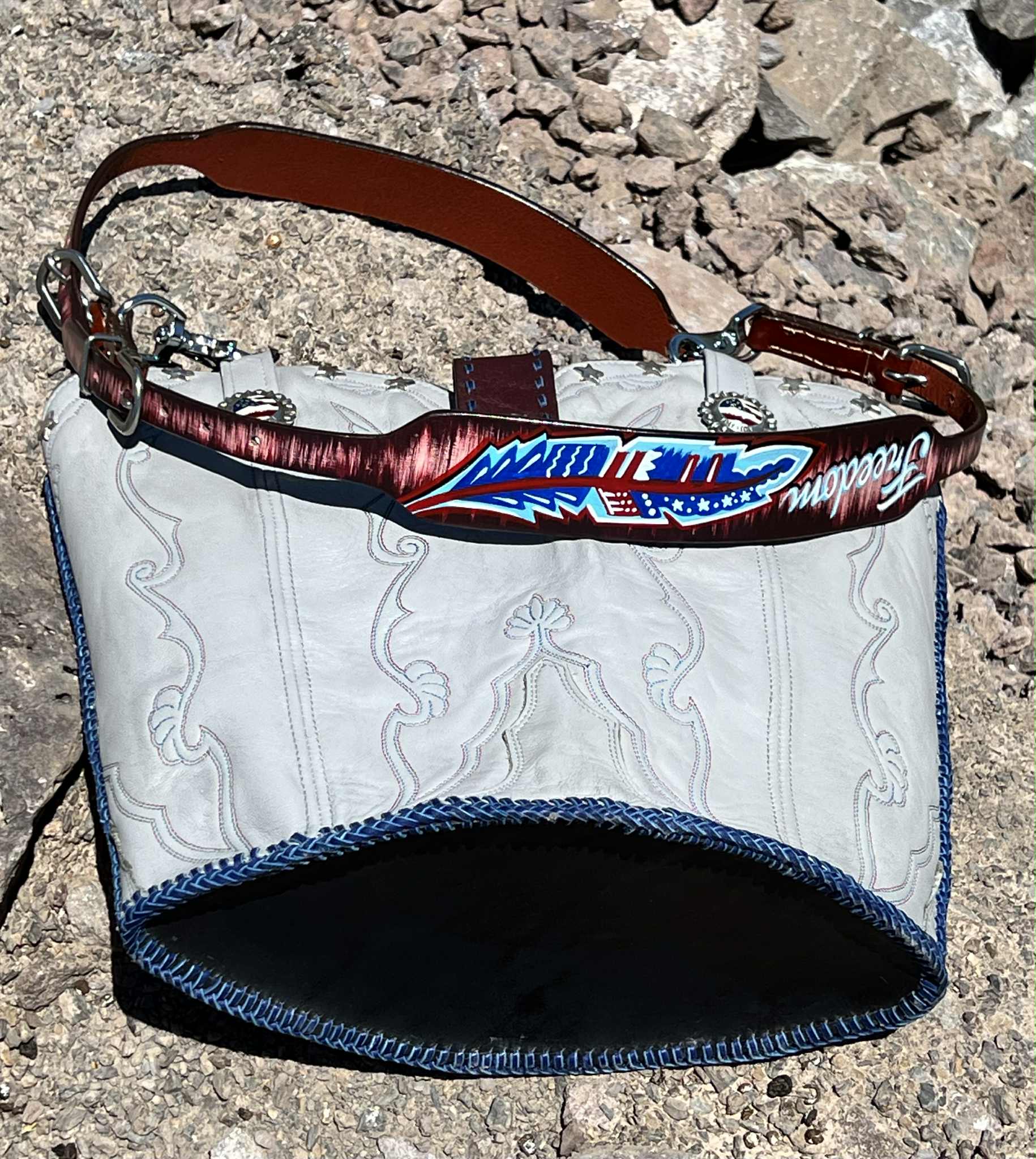 Leather wither straps—originally horse tack—serve as the adjustable handles. They are painted with a feather motif and the word “FREEDOM,” and attach with swivel hooks for ease and versatility. The bag’s structure is crafted using three traditional hand-sewing methods: running stitch, double loop lacing, and appliqué lacing—each stitch telling a story of care and individuality.
