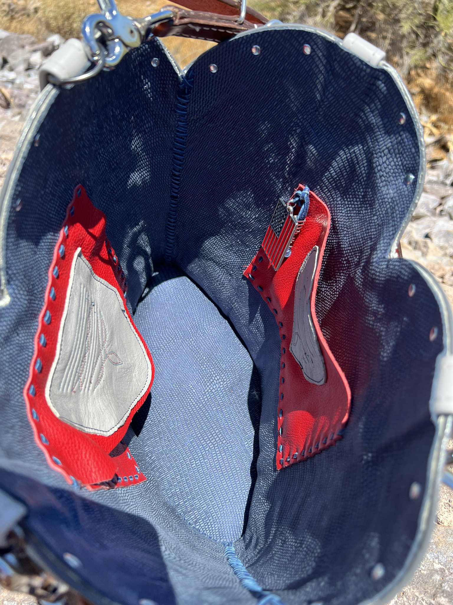 Celebrate liberty and craftsmanship with this one-of-a-kind handbag, handcrafted from deconstructed vintage cowboy boots and inspired by the spirit of American pride. This ruggedly beautiful bag features a rich blue embossed leather interior and two hand-sewn red leather pockets, each stitched in with durable leather lace. One pocket has an open design adorned with a metal flag charm, “FREEDOM” letter dangles, and a heart-shaped leather patch reclaimed from the original boot. The second pocket features a flap closure and a coordinating leather patch.