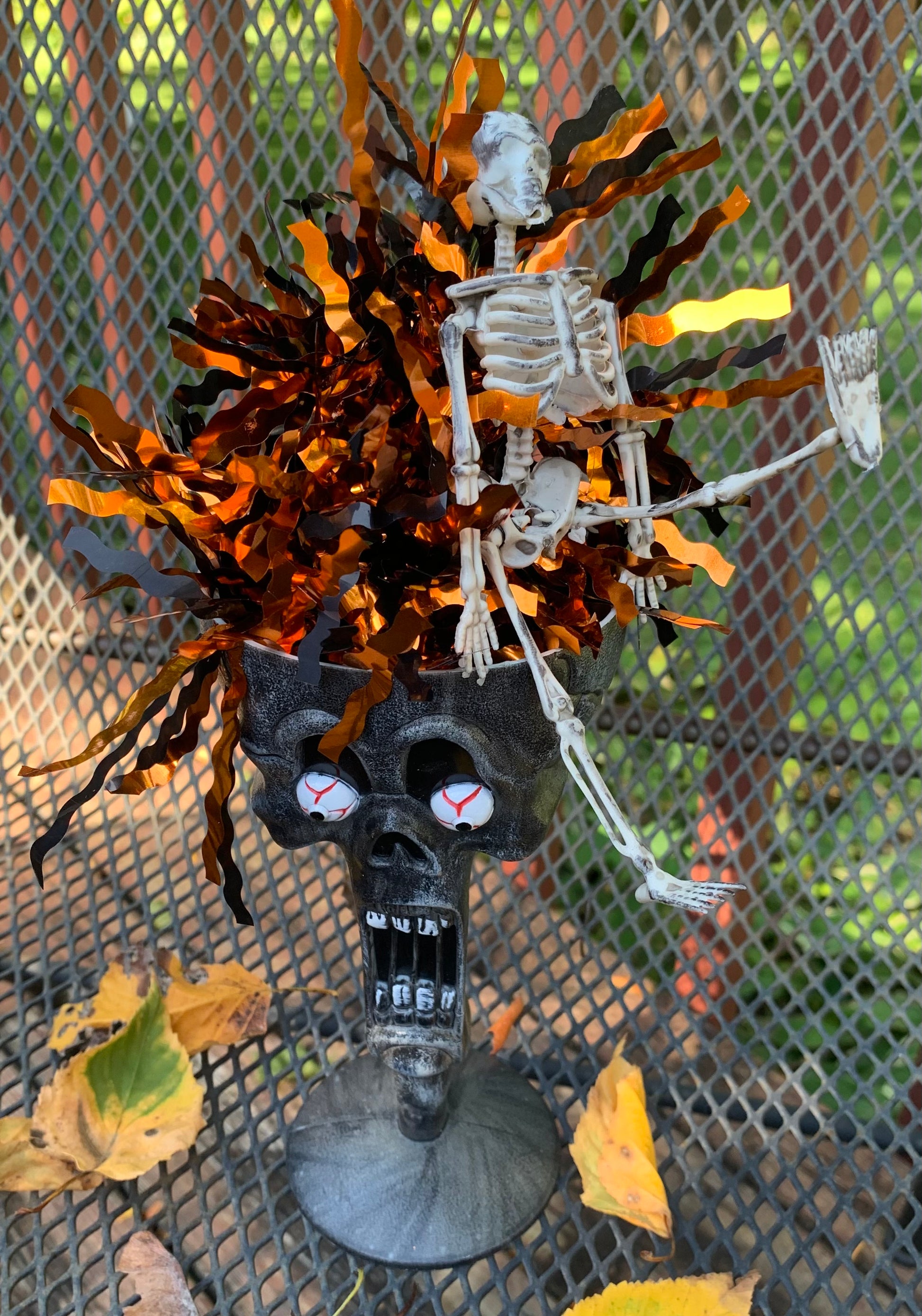 Measuring 11 inches tall by 6 inches wide and 5 inches deep, this goblet is equal parts spooky and silly. With bulging white eyes veined in red, a wide-open toothy grin, and a sparkly black-and-orange hairdo gone terribly wrong, it’s a fright you can’t help but laugh at. Perched right on top of the wild hairstyle sits a skeleton as if he can’t quite believe he’s there, making this ghoulish goblet a playful statement piece for Halloween fun. Place on a Halloween party table or add to your mantel or shelf for a whimsical, spooky pop of color. Display near candy dishes, drink stations, or bar setups as a humorous accent. Gift to your favorite hair stylist or someone who loves their Halloween décor with a twist of humor.