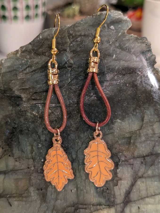 These golden oak leaf charms are on brown leather with gold findings. Hypoallergenic ear wires.