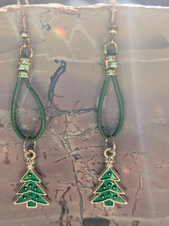 These earrings have green tree charms trimmed in gold with green leather and gold findings. Perfect for you holiday outfits. Ear wires are hypoallergenic.