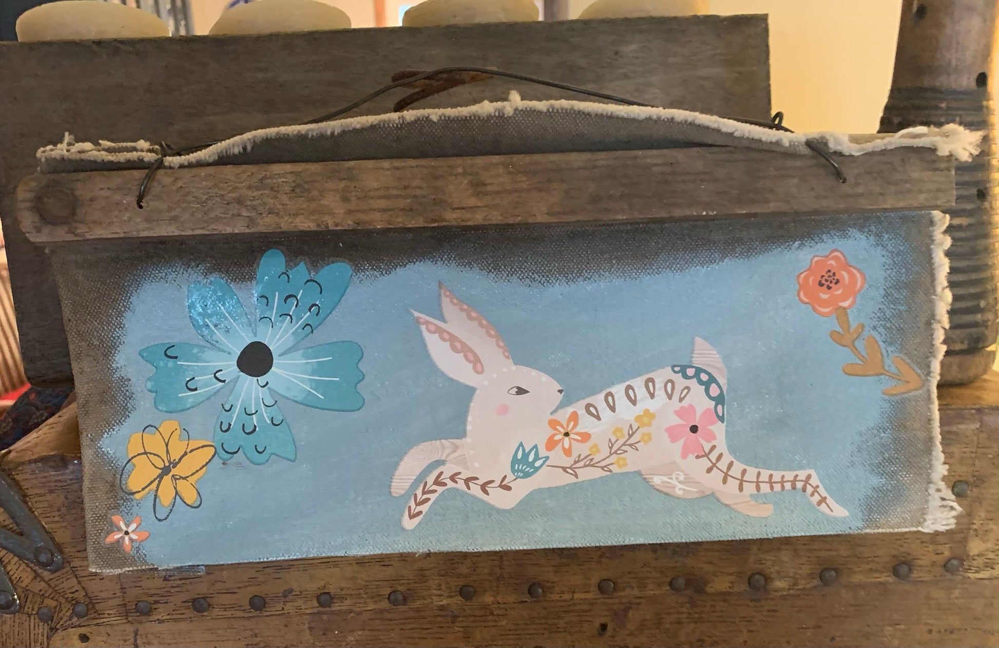 This unique piece is created on a 5½ x 12-inch clay-based painted vintage canvas, topped with a strip of vintage tobacco lath for rustic charm. A vintage metal fastener adds a touch of aged character, and a wire hanger makes it ready to display.