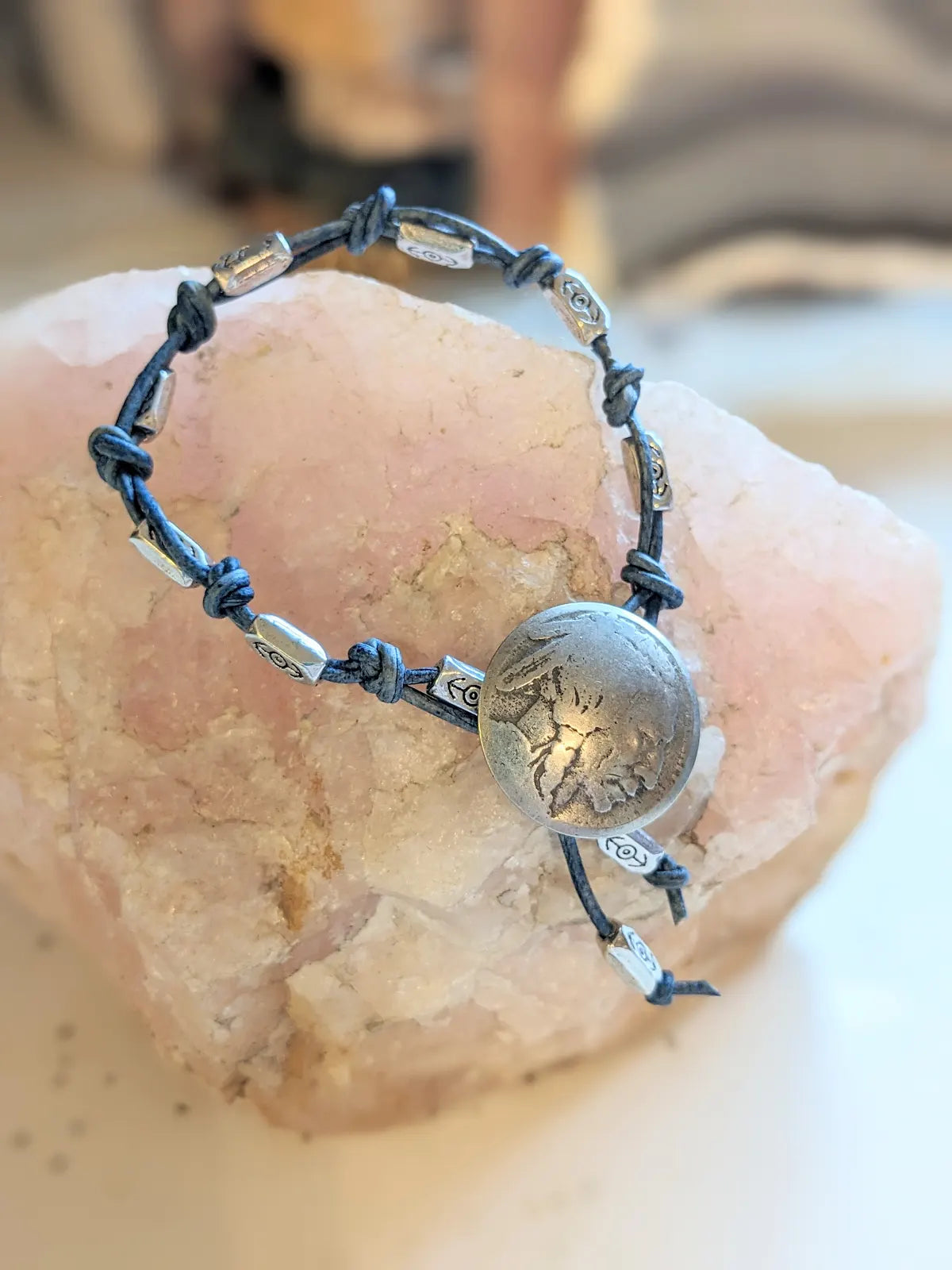 Handmade knotted turquoise leather bracelet with arrow beads and a genuine Indian Head coin button for the clasp. Size 6.5.