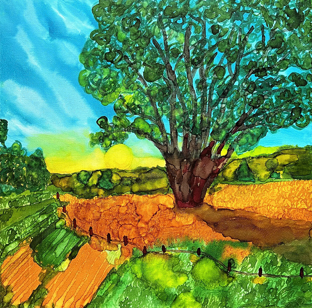 Majestic Tree Original Alcohol Ink Landscape Painting is of a large, beautiful tree set in a field near a walking path. Standing tall and proud in the middle of a sprawling field, a majestic tree commands attention with its imposing presence. Its trunk, weathered by time and adorned with intricate patterns of bark, reaches skyward with unwavering strength. The branches, stretching toward like outstretched arms, are adorned with a lush canopy of leaves that rustle softly in the breeze. Underneath the tree’s protective embrace, a sense of tranquility envelops the surrounding landscape, inviting passerby to pause and marvel at the wonders of nature. As the sunlight filters through the foliage, dappling the ground below with a warm, gold glow, the tree becomes a symbol of resilience, wisdom, and the enduring beauty of the natural world. Done on 20x20 gallery wrapped canvas, sealed with UV varnish.
