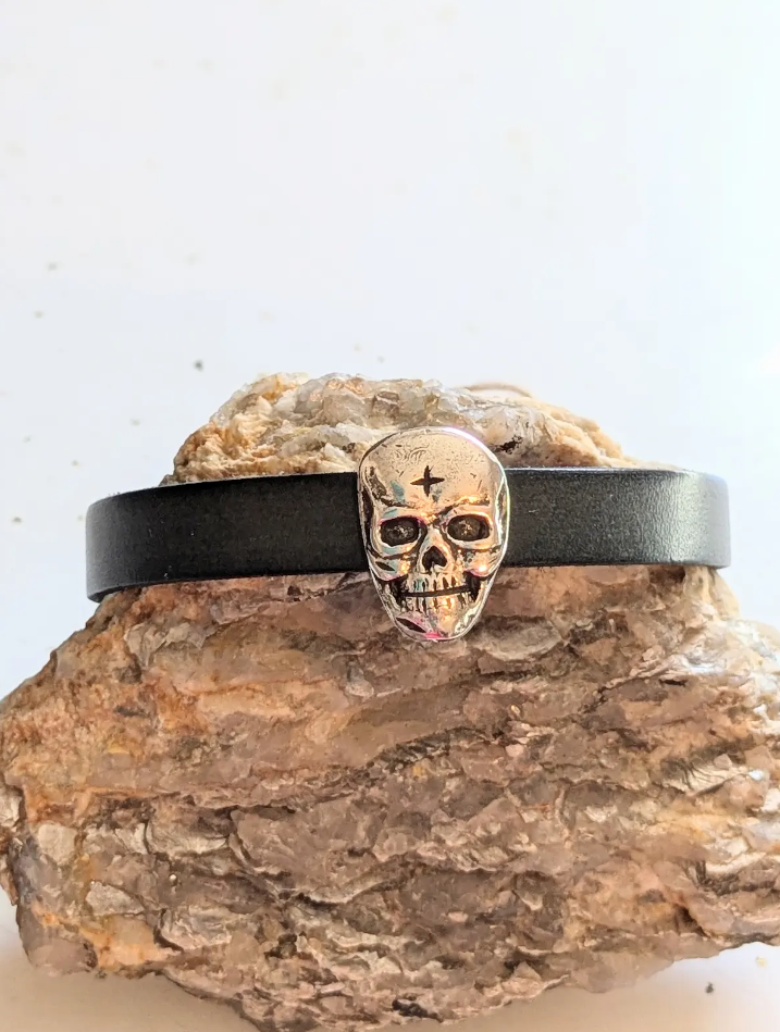 New men's line! This is a very edgy and masculine black leather bracelet with a skull slider and a large silver magnetic clasp. Will be "fit to size" so be sure to check your size in the drop-down box.
