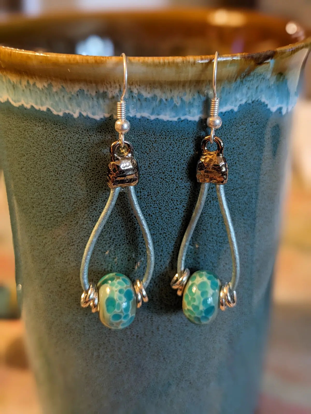 Handmade earrings with lamp work beads and silver rings with a mermaid vibe. Tierracast end caps and hypoallergenic ear wires.