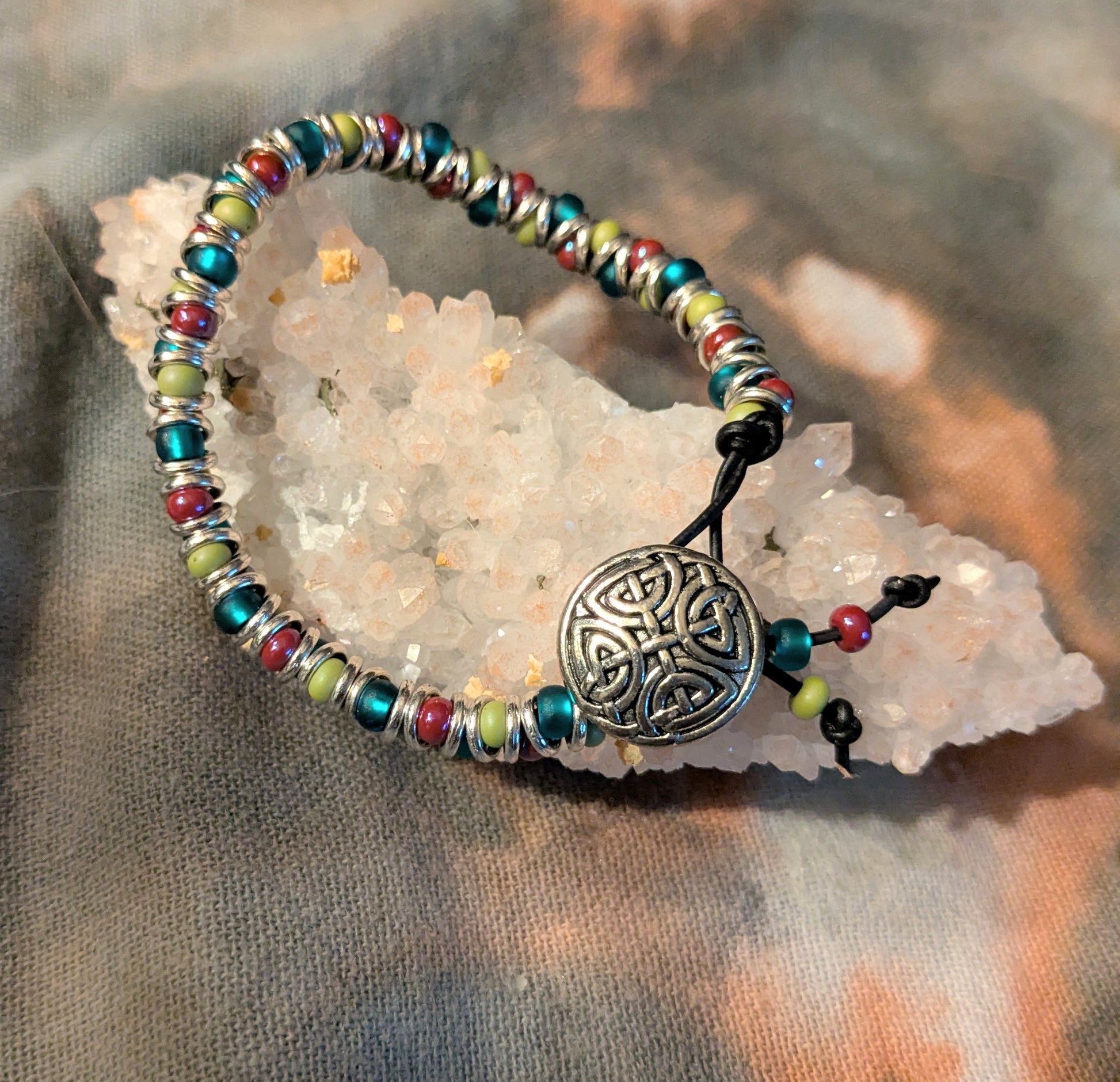 Calling all bracelet lovers! A fun beaded bracelet on leather with a lot of metal and a silver button clasp. Great by itself or add it to your stack. Size 7.5