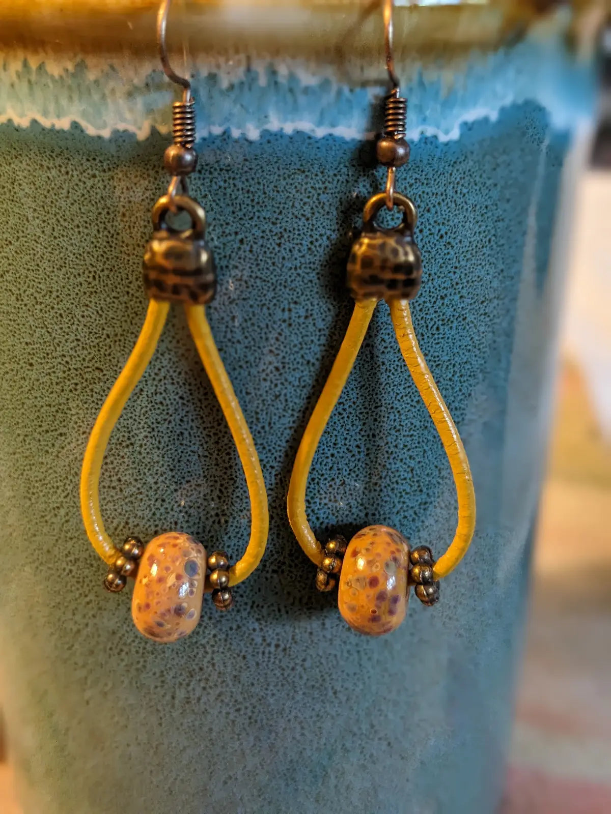These neutral colored lamp work beads on neutral leather will look good with just about anything. Brass colored Tierracast findings and brass hypoallergenic ear wires.