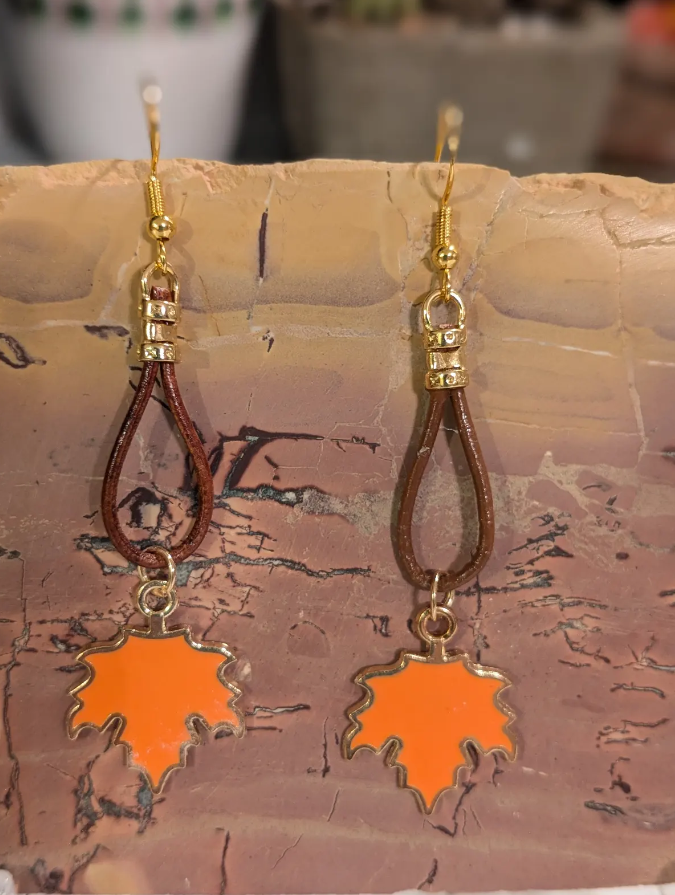 These are a Fall classic! Orange maple leaf charms on brown leather with gold findings. Hypoallergenic ear wires.