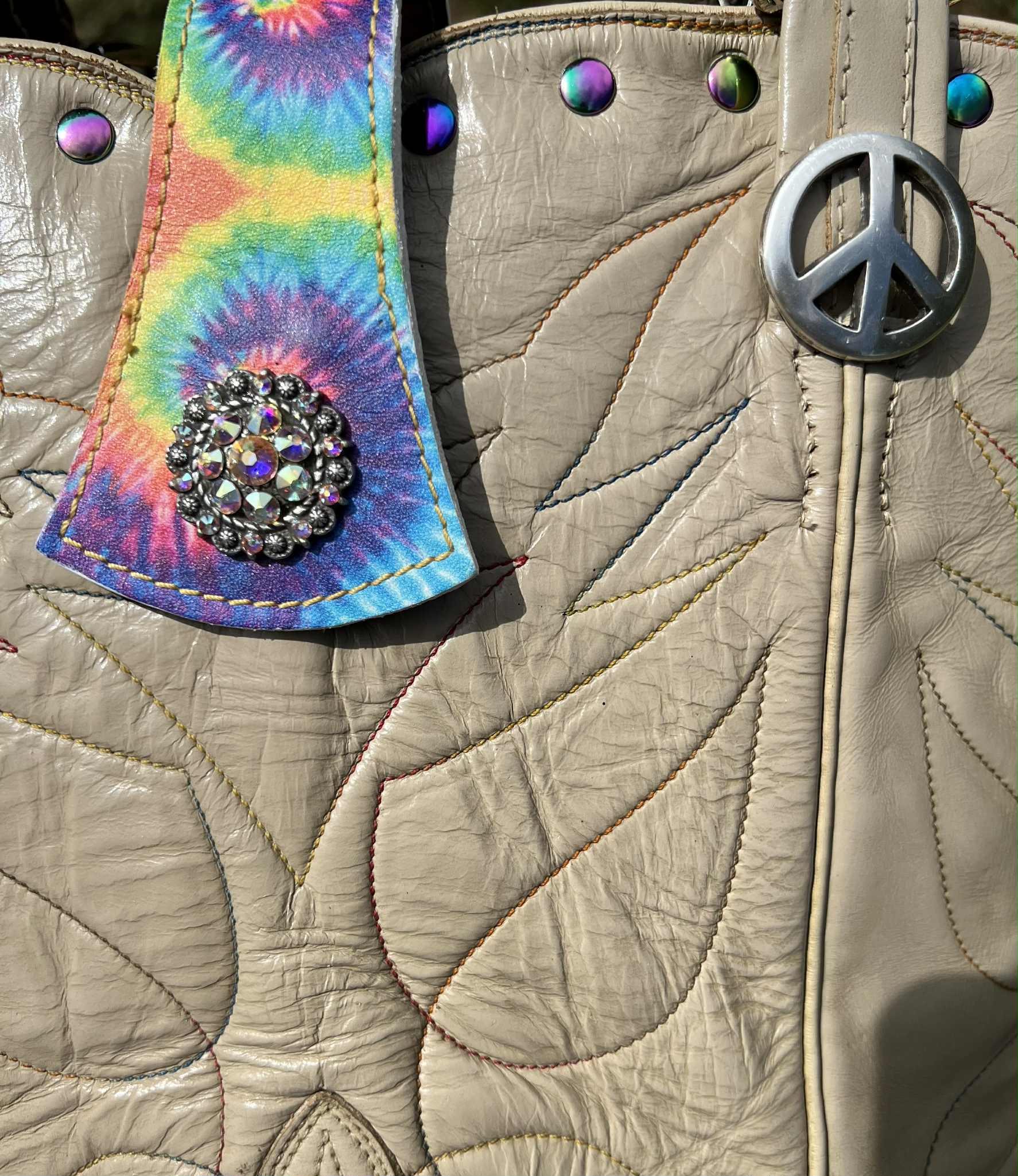 This one-of-a-kind bag brings together the spirit of the open range and the joy of a bohemian rainbow. Handcrafted from a pair of Tony Lama cowboy boots with vibrant rainbow stitching and tie-dye printed leather, it’s a bold, joyful tribute to hippie-western style. Each boot pull is adorned with a nickel-plated peace sign concho, while rainbow rivets and rhinestone details add that extra sparkle and soul.