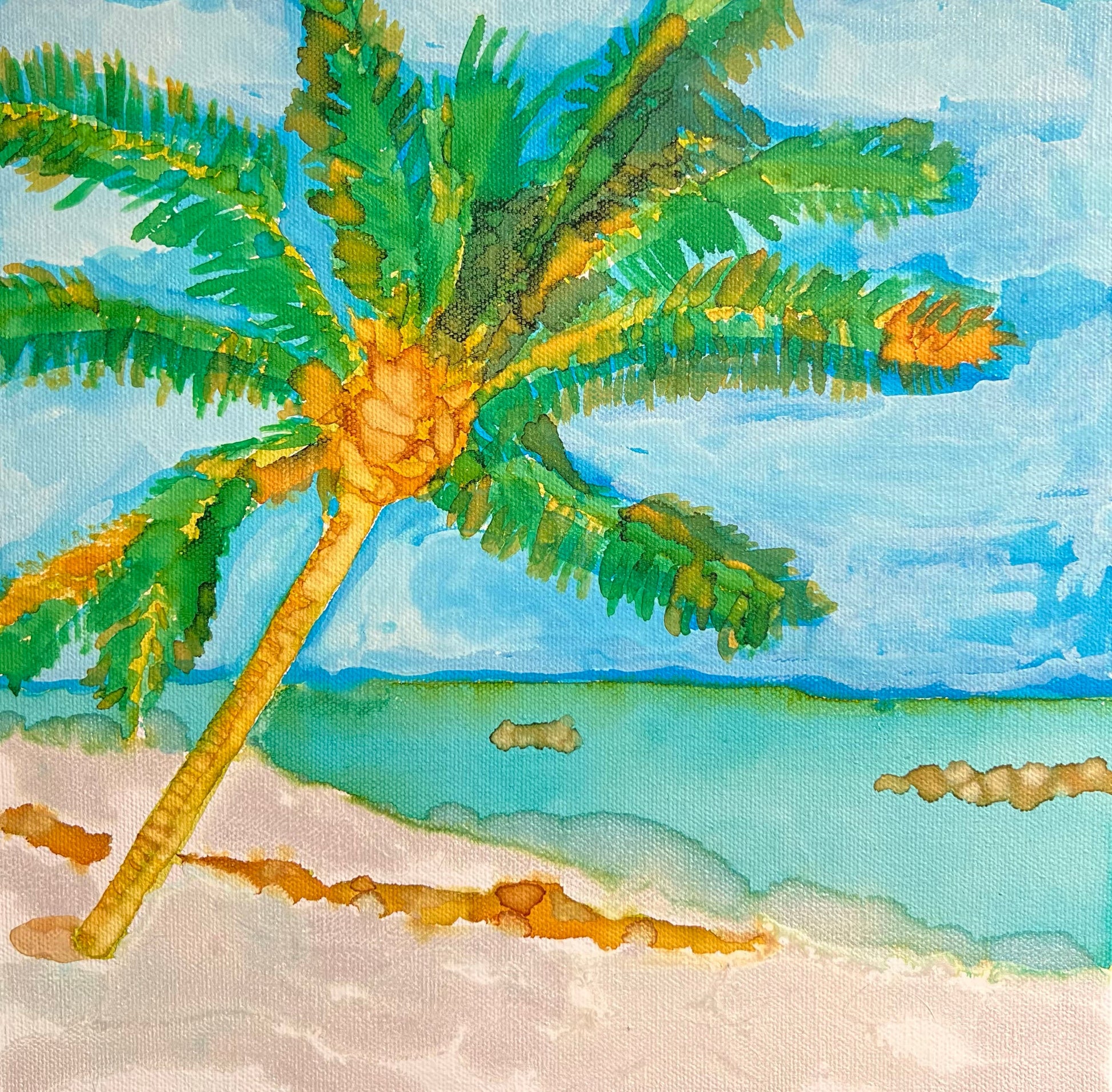 Pearly White Sandy Beach Original Alcohol Ink Landscape Painting is of a white sandy beach, with water ad a large palm tree. A pristine, pearly white sandy beach gently kissed by the crystal-clear, calm waters of the ocean. A palm tree sways lazily in the soft breeze, casting dappled shadows on the sand. The air is filled with the soothing sound of waves lapping against the shore, creating a tranquil oasis perfect for relaxation and contemplation. Done on a 12x12 gallery wrapped canvas with alcohol inks, sealed with UV varnish.