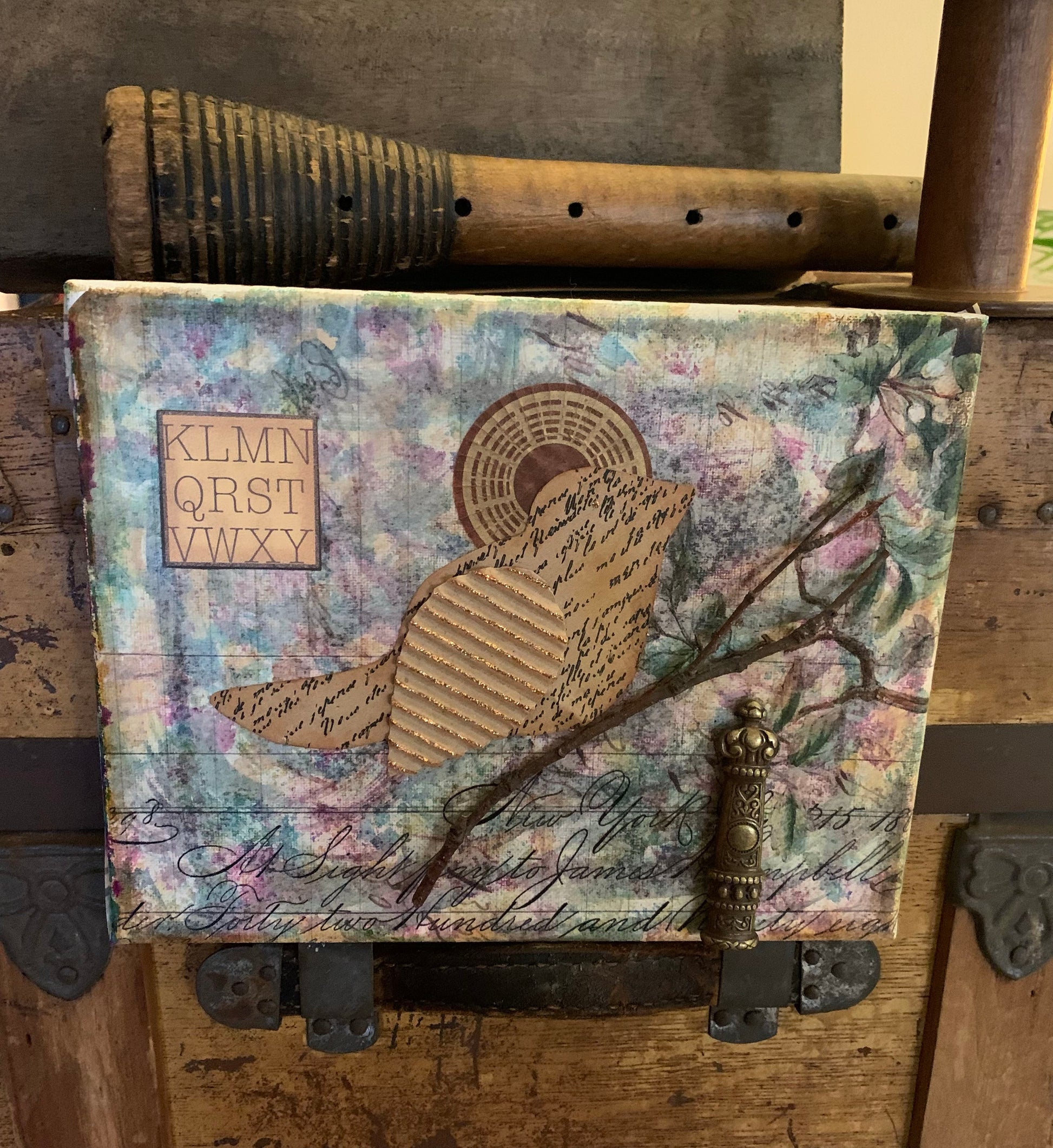 This mixed media piece is created on a 10 by 10-inch canvas, perfect for hanging or displayed as a shelf leaner. It invites you into a world where paper holds power