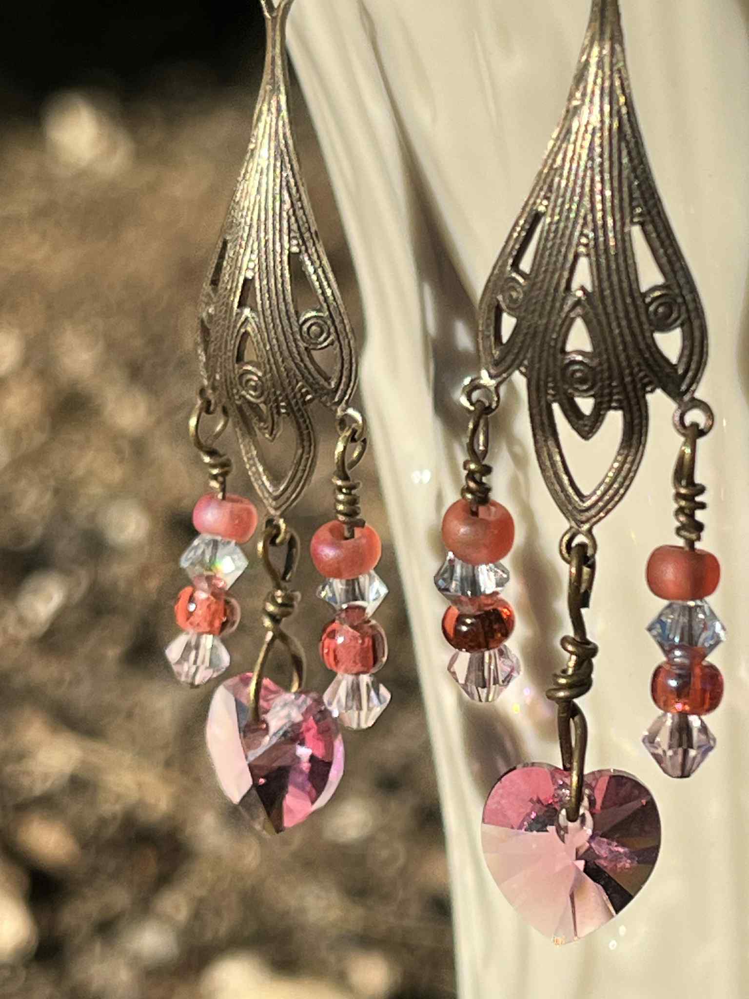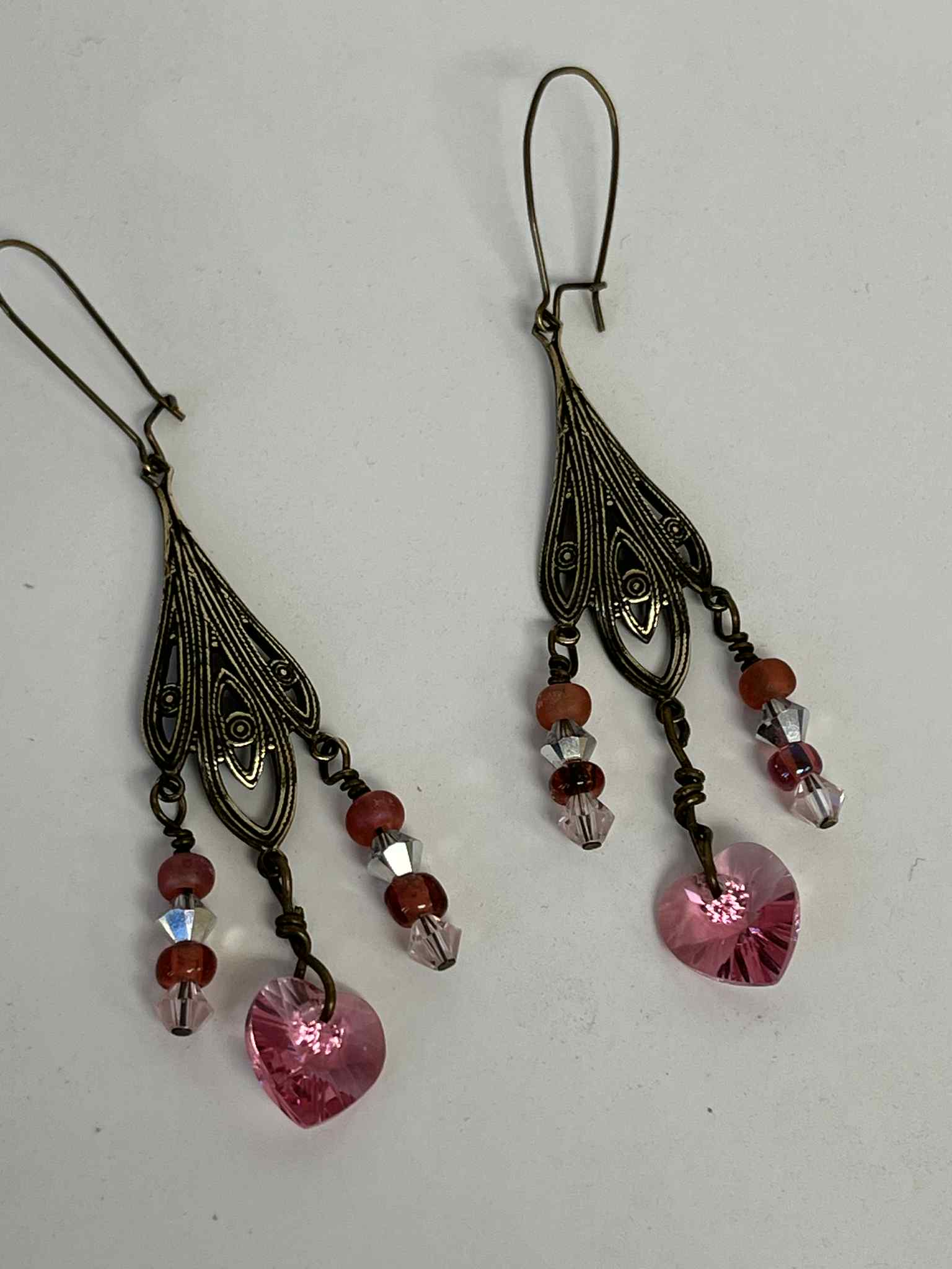 Soft, romantic, and quietly luminous, these vintage-inspired chandelier earrings feature blush-pink Swarovski crystal hearts paired with coordinating pink and clear crystal accents as well as pink beads. The gentle tones catch the light with a subtle shimmer, creating movement that feels elegant rather than flashy.