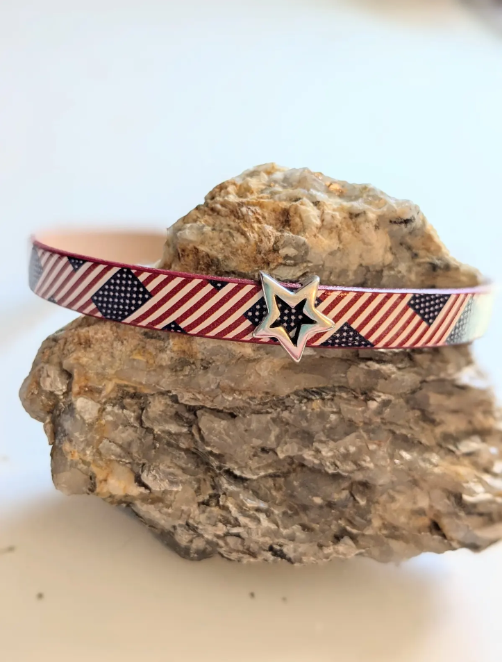 Just in time for the 2024 election! This patriotic leather bracelet with a silver star slider can be for a man or a woman. Will be "fit to size" so be sure to check your size in the drop-down box.