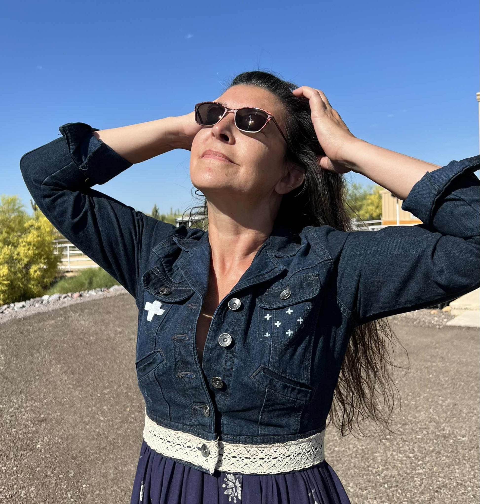 This vintage indigo denim jacket has been transformed into a powerful piece of wearable inspiration — feminine, rugged, and full of courage.