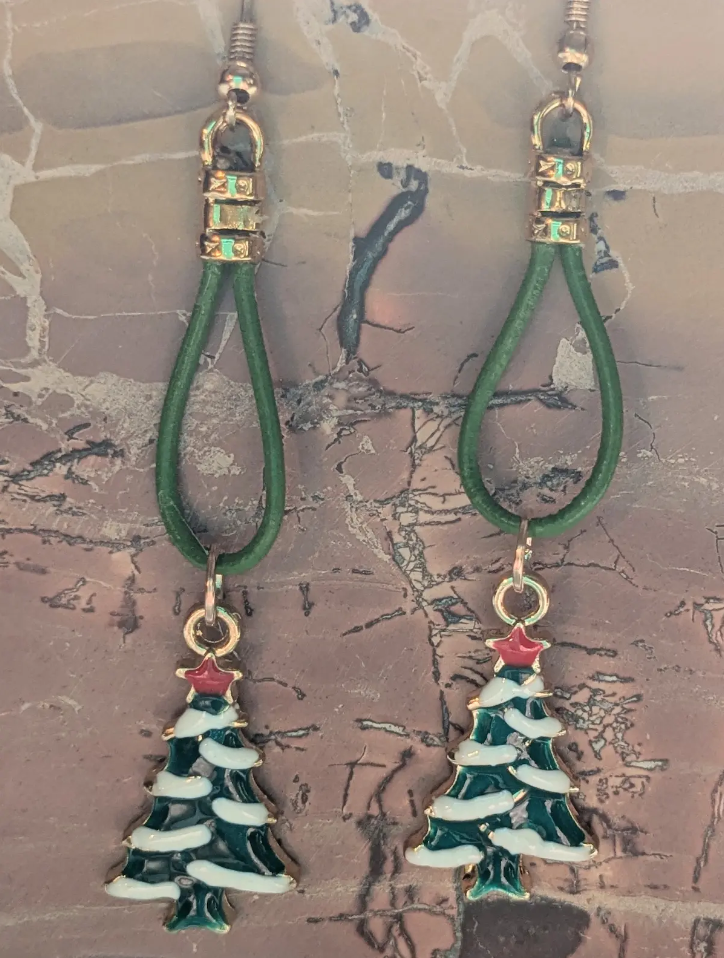 Christmas tree earrings trimmed with snow and a red star. Green leather and gold findings. Perfect for your holiday outfits. Ear wires are hypoallergenic.