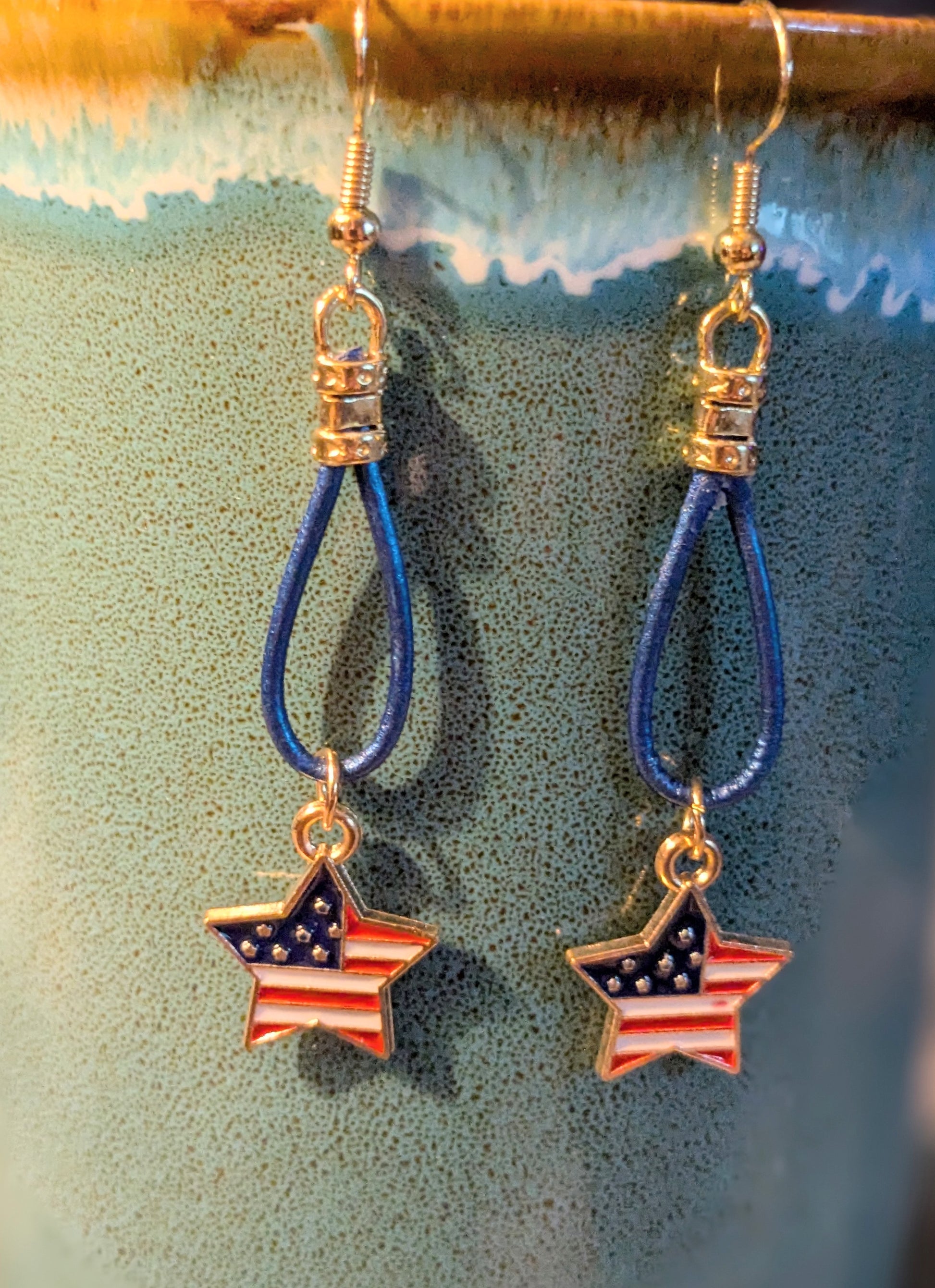 Do you have a love for all things red, white and blue? Then these star earrings are made for you! Star flag charms on blue leather with gold tone findings. Ear wires are hypoallergenic.