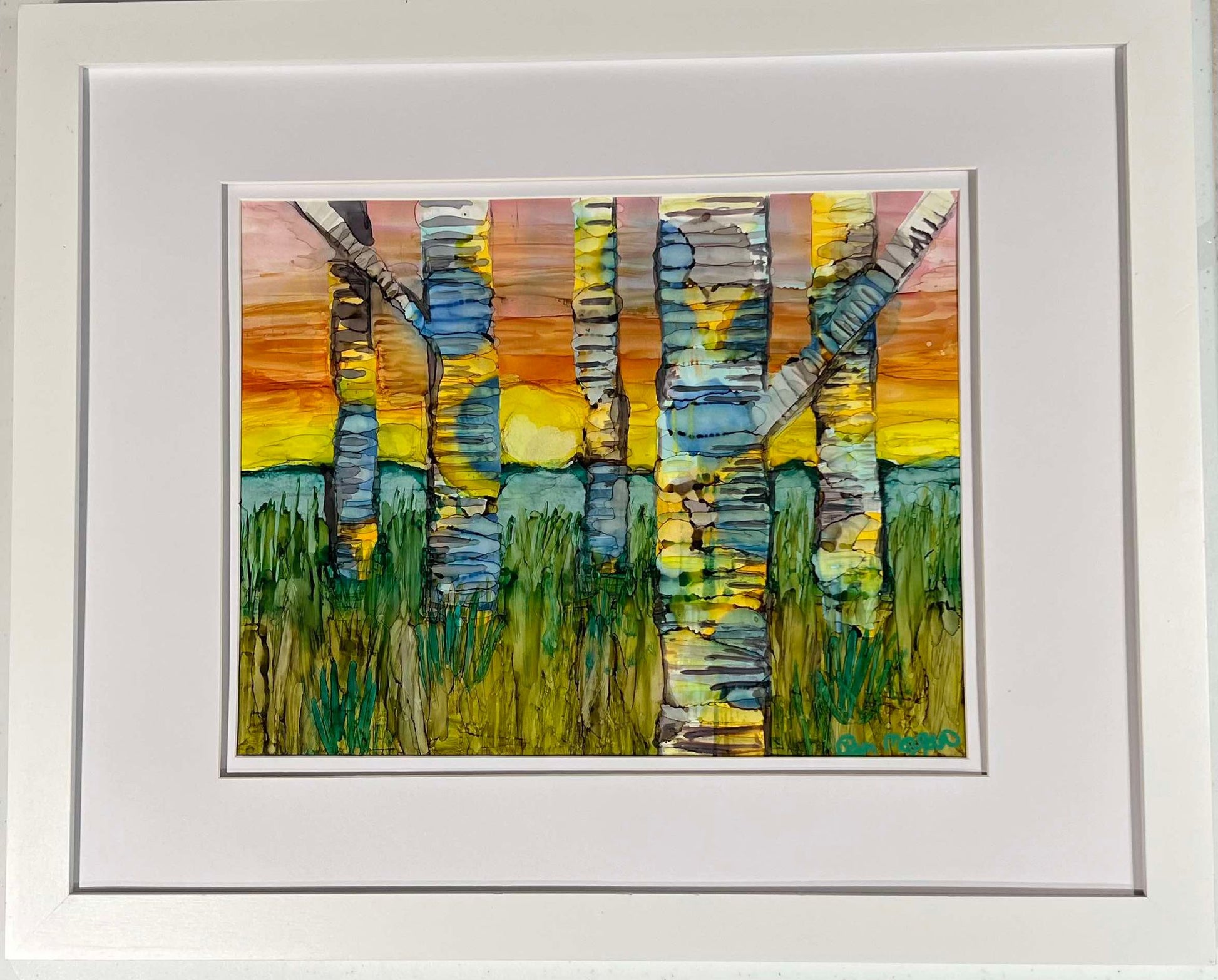 Summer Sunset is an original alcohol ink landscape painting of a colorful sunset of yellow, orange and pink, that overlooks water, a grassy field and birch trees. In “Summer Sunset,” a breathtaking alcohol ink painting captures the essence of a tranquil evening in nature. Towering birch trees stand tall against a backdrop of a grassy field, and water, their slender trunks adorned with vibrant splashes of color that evoke warmth and splendor of a summer sunset. As the sun dips below the horizon, it bathes the landscape in a golden glow, casting long shadows that stretch across the verdant meadow. The scene is alive with the quiet beauty of nature, inviting the viewer to pause and savor the fleeting moment of serenity and stillness. With each brushstroke, “Summer Sunset” captures the magic of a summer evening, transporting the observer to a place of tranquility and wonder amidst the colorful birch trees and lush greenery. Done on 11x14 Yupo paper with alcohol inks, sealed with UV varnish. White frame is 16x20 and is synthetic wood.