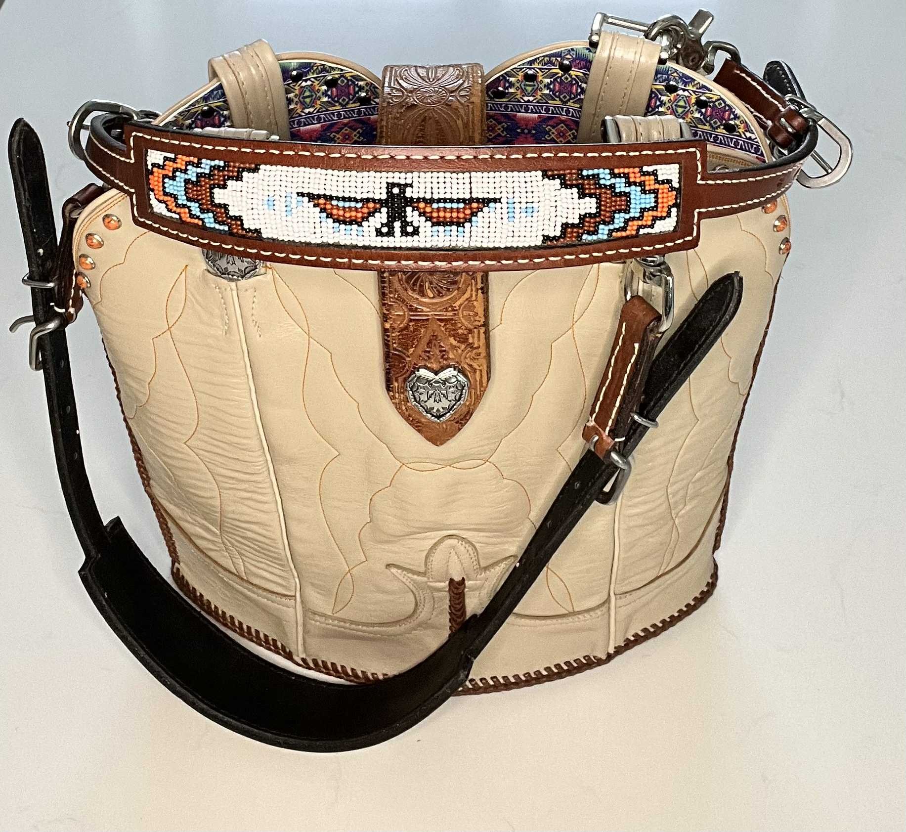 The shoulder straps are made from Showman Thunderbird bead-inlaid wither straps, finished with swivel hooks for versatility. Fully adjustable, they bring both function and flair. Inside, the bag features Thunderbird-printed leather with orange pig suede for the two hand-stitched pockets—one open, one flap closure—complete with a Thunderbird concho and tassel detail, because attention to detail matters!