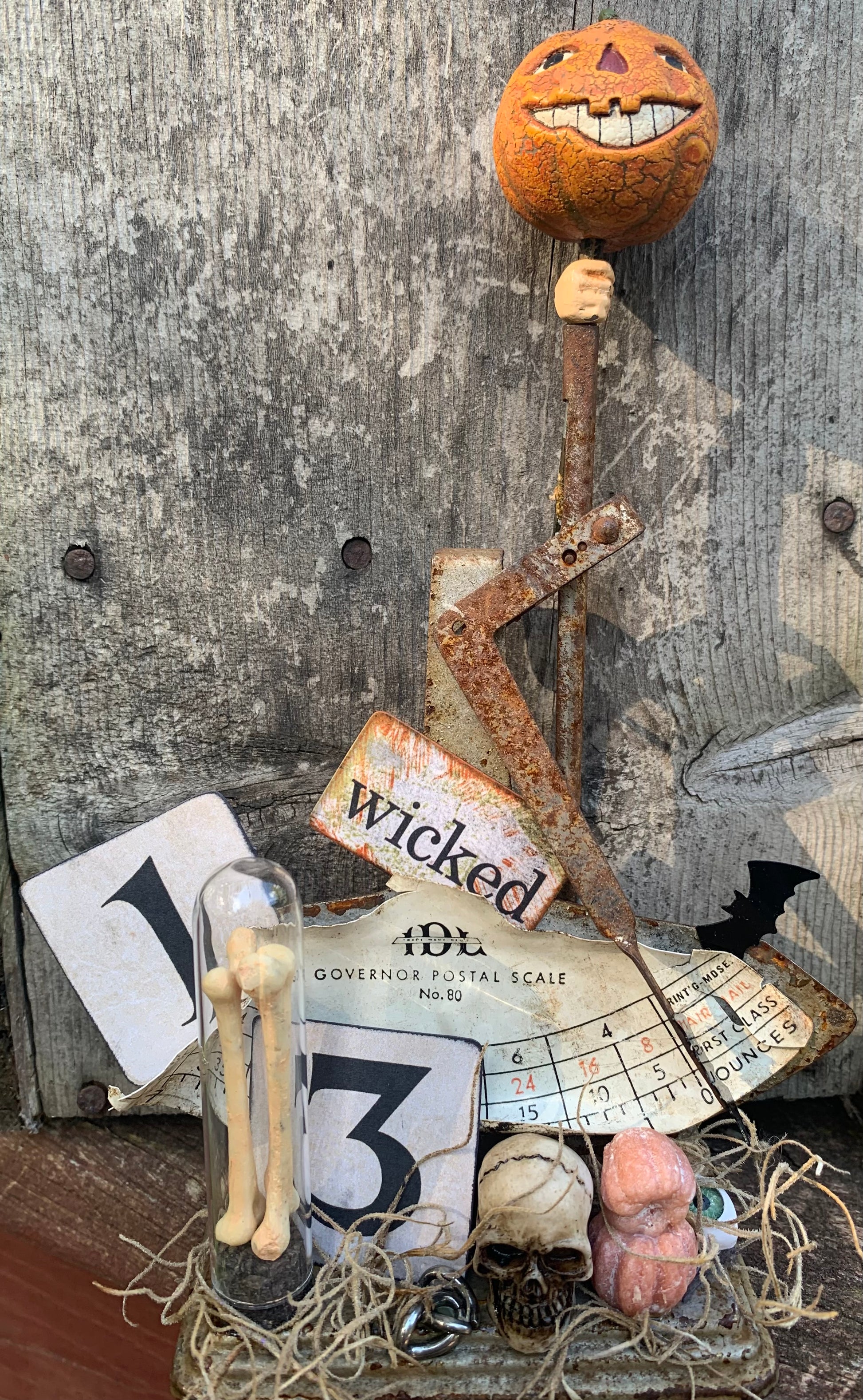Perched atop a vintage, rusty postal scale with its label peeling off, a mysterious hand extends a smiling pumpkin on a stick, greeting the curious and the brave. Encircling a vial of bones are cryptic numbers, a skull, two miniature pumpkins, and a lone blue eye, all under the watchful proclamation: “wicked”. This whimsical yet eerie composition blends the charm of old-world curiosities with the delight of Halloween mischief, creating a small cabinet-of-wonders vibe that captivates the imagination. This whimsical piece measures 7 X 3 1/2 X 2 3/4 inches. Add it to a Halloween mantel or tabletop arrangement for an instant conversation starter. Place on a shelf, a bookcase or on a table to surprise visitors with its playful eeriness.