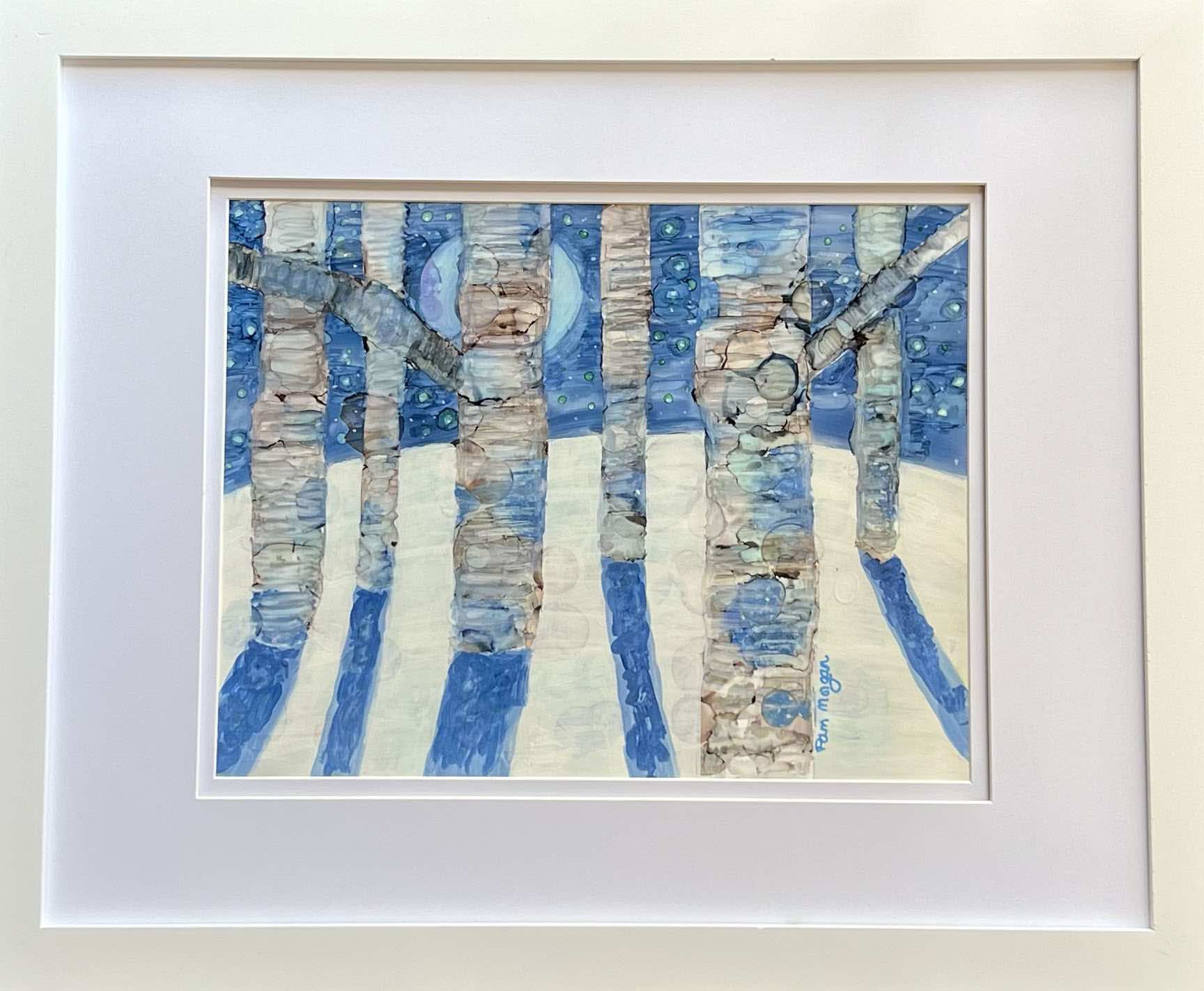Winter Moon is an enchanting alcohol ink painting that captures the serene beauty of a snowy night under a brilliant moonlit sky. The painting features slender birch trees with their distinctive white bark, intricately detailed with streaks of black, brown and hints of blue reflecting the glow of the moon. The deep blue sky is sprinkled with twinkling stars, adding a touch of magic to the scene, while a large, luminous moon dominates the night, casting its cool light over the landscape. The snow beneath the trees is dappled with soft blue shadows, mirroring the moon’s ethereal light, creating a peaceful, dreamlike atmosphere. The scene evokes the quiet stillness of winter, where nature rests beneath a tranquil, starry sky. Done on Yupo paper with alcohol inks, sealed with UV varnish, double matte and white wood frame. Picture size: 11x14. Framed size: 16x20. $150.00