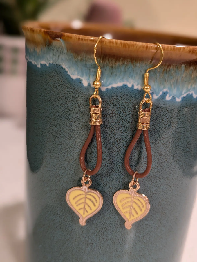 These earrings have yellow Aspen leaf charms with brown leather and gold findings. Hypoallergenic ear wires.